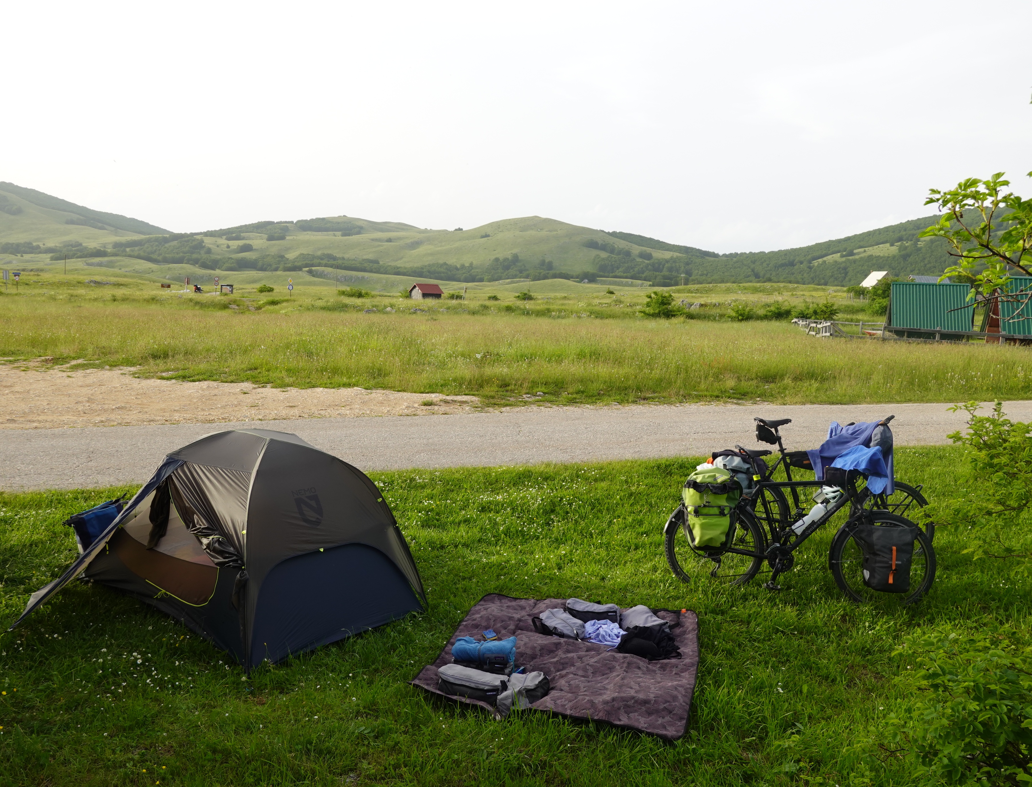 Ces mille mètres d’ascension au profil lardé de raidillons décourageants compterons parmi les plus éprouvants depuis notre départ. Heureusement, le point de vue sur les gorges et une source fraîche bienfaitrice nous attendent là haut. La route de plateau qui mène ensuite à Trsa épuisera nos dernières forces du jour en usant de l’arme anti-cycliste absolue : les montagnes russes. Le profil le plus absurde que l’on ait jamais vu, aux ondulations accablantes pour les jambes et le moral, résultat de l’érosion karstique spectaculaire qui a créé un paysage de dolines unique.