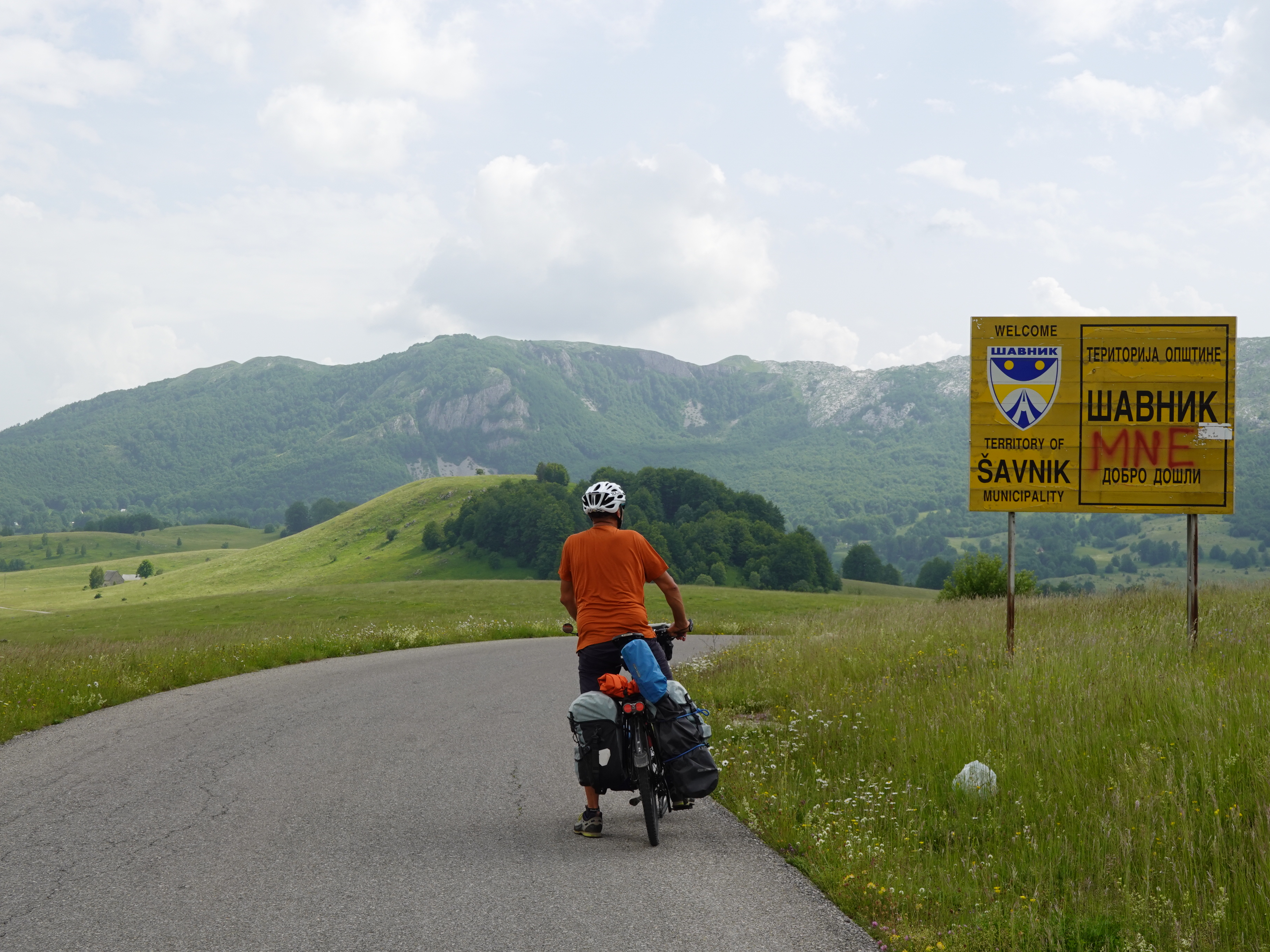 Cette journée d’approche difficile donne accès au parc national du Durmitor. Nous le traverserons en compagnie de Kobe et Willebrandt, deux cyclos belges que nous avions déjà croisés à Sarajevo. La route passe en revue les plus hauts sommets du pays, dont le Prutaš (2393 m) et ses falaises verticales, dans un paysage de haute montagne assez inédit. Chaque virage est un émerveillement. Nous aurons même le plaisir de voir le soleil s’imposer sur les nuages pour la fin du parcours.