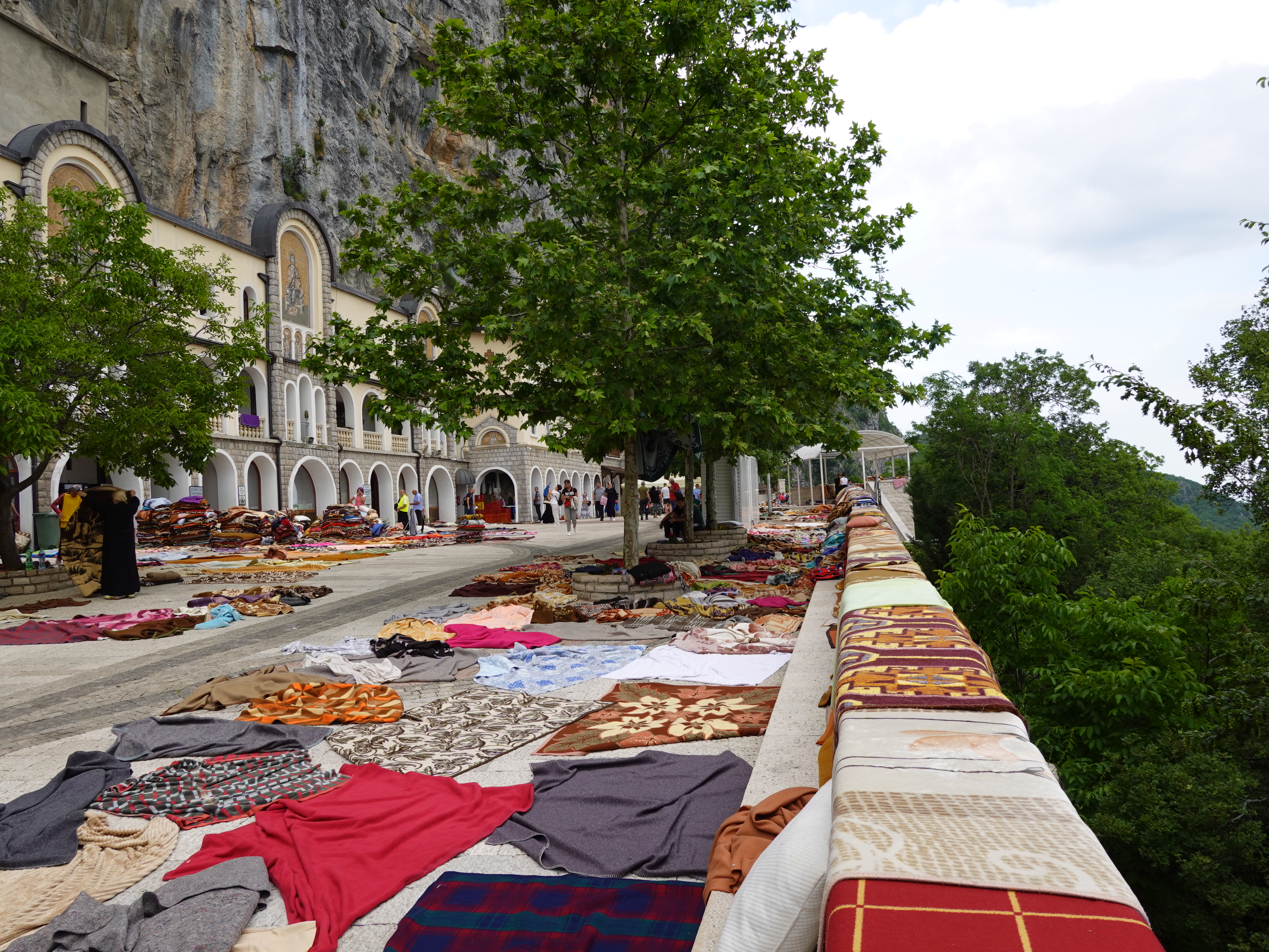 Le passage à Ostrog sera l’occasion d’une belle grimpette au monastère. Lieu de pèlerinage orthodoxe de premier ordre, il est également fréquenté par les catholiques et les musulmans. Tous comptent bien sur les reliques de Saint-Basile conservées ici pour accomplir des miracles et exaucer leurs voeux ! C’est surtout pour nous un bâtiment troglodyte incroyable, niché à 700m au-dessus de la vallée de la Zeta. Les pèlerins y dorment à la belle étoile pour mieux s’exposer à la grâce divine mais hier soir, un violent orage a douché des milliers de couvertures que nous trouvons séchant pêle-mêle au soleil. Nous avions prévu d’y passer la nuit mais il règne ici une atmosphère plus proche de la foire que de la spiritualité et de la sérénité que nous escomptions. En dépit des kilomètres et des dénivelés déjà accumulés, nous poursuivons donc notre étape, et profitons de la lumière du soir dans les odeurs de garrigue qui nous rappellent que la Méditerranée n’est plus très loin.